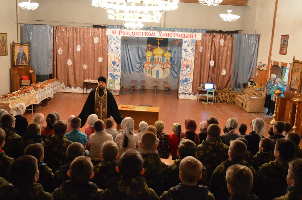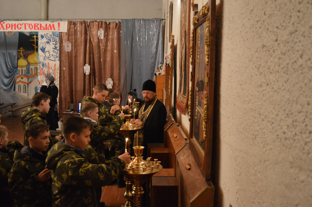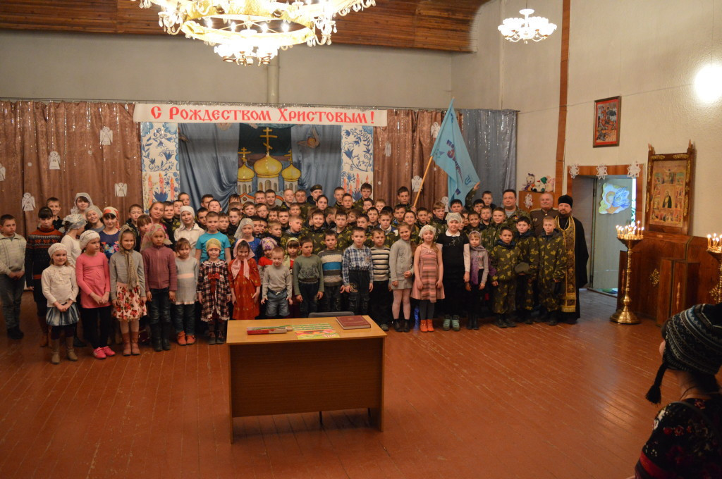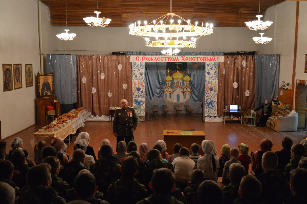 29 марта в Православном культурно-просветительском центре Спасского прихода в рамках празднования 70-летия Победы в Великой Отечественной войне состоялась встреча с казаками учащихся Воскресной детской школы и молодежного объединения «Застава», посвященная войсковому празднику Забайкальского казачества. 30 марта Православная Церковь празднует память преподобного Алексия, человека Божия. В этот день в 1851 году было образовано Забайкальское казачье войско, возрожденное в 90-х годах на земле Забайкалья. Гостями центра стали курсанты Краснокаменского военно-патриотического клуба «Зарница» с инструктором Дорощуком Дмитрием Владимировичем, а также заместителем атамана Краснокаменской станицы Грибановым Валерием Михайловичем. Встреча началась с торжественного построения ребят в военной форме, со знаменем «Зарницы». Игумен Симеон (Зимняков) рассказал о празднике, о роли казаков как первопроходцев и защитников рубежей нашего Отечества и хранителей веры Православной, поздравил с праздником именинников. В.М. Грибанов изложил основные события истории Забайкальского казачества, рассказал о том, чем занимаются современные казаки. А директор детской Воскресной школы Т.Г. Алявдина представила страницы истории и традиций казаков, проживавших в селах нашего района по материалам книги «Наш славный Краснокаменский район». Среди участников клуба оказалось немало потомков забайкальских казаков, отрадно, что ребята знают об этом, гордятся своей фамилией. Игумен Симеон (Зимняков) отметил, что все важнейшие события в жизни казаков начинались в православном храме, с молитвы. Не случайно и на войсковом знамени было изображение Спаса Нерукотворного Образа и надпись «С нами Бог!». Настоятель показал курсантам, как правильно ставить свечи, и ребята зажгли их у икон с молитвой о здравии своих родителей. Завершилась встреча чаепитием с вкусной выпечкой, подаренной благотворителями. Пресс-служба Краснокаменского благочиния. «Казак без веры не казак», — рассказал ребятам игумен Симеон Также перед молодёжью выступили заслуженные казаки Краснокаменской станицы С молитвой к прп. Алексию, человеку Божию, обратились ребята «Заставы» Праздник получился замечательным!