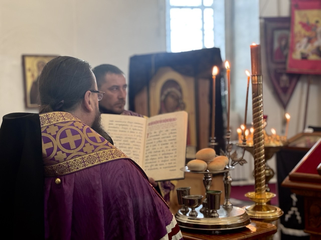 Его Преосвященству сослужили: клирик соборного храма Спаса Нерукотворного Образа г. Краснокаменска иерей Ростислав Зинченко; ключарь кафедрального собора Воскресения Христова г. Нерчинска иерей Роман Пичуев.
