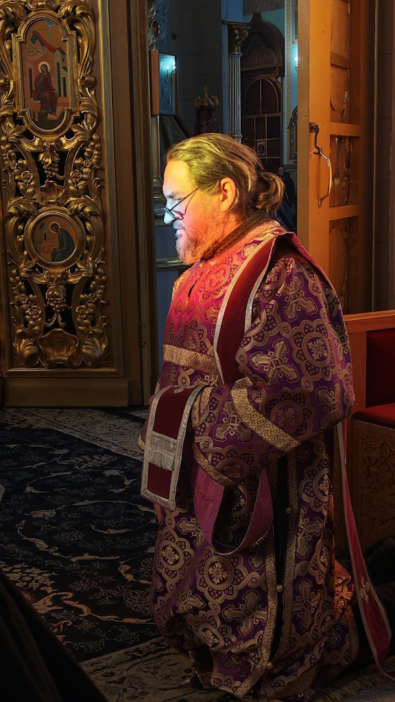 Перед Литургией были совершены уставные великопостные богослужения — часы, изобразительны и вечерня.