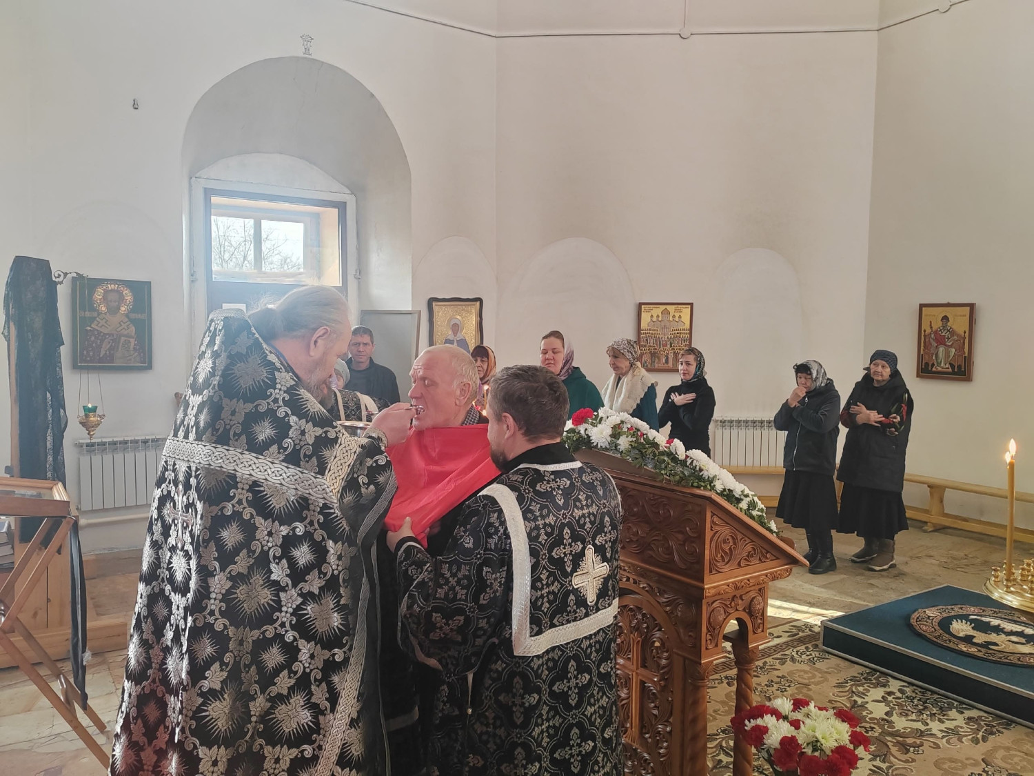 Перед Литургией были совершены уставные великопостные богослужения — утреня, часы, изобразительны и вечерня.