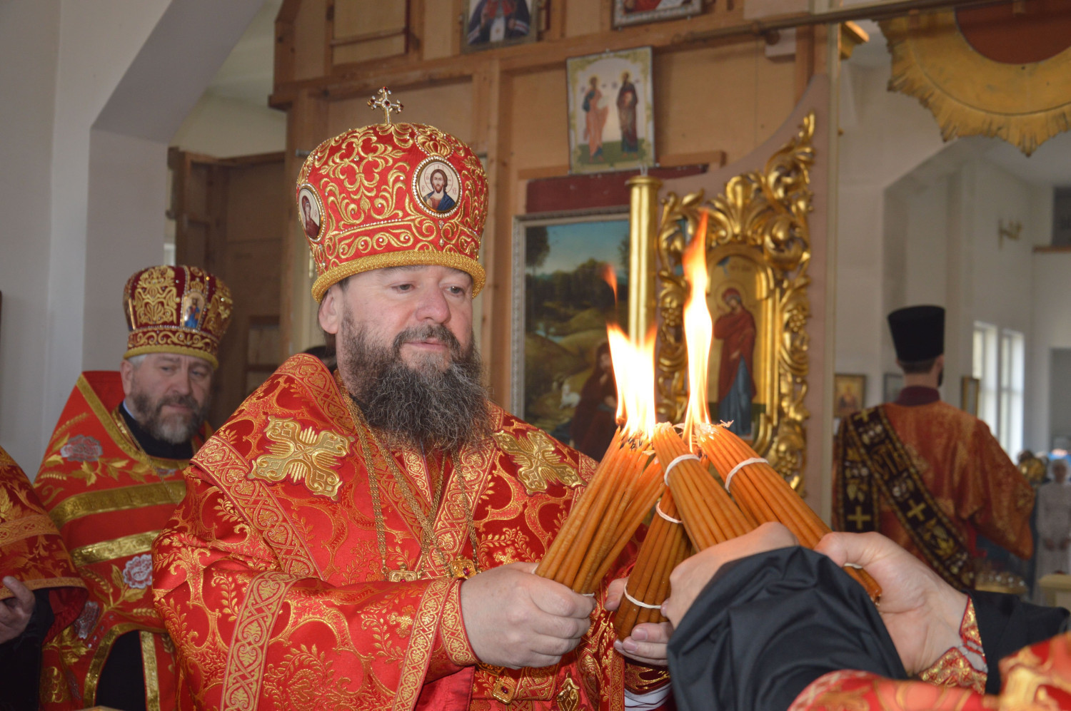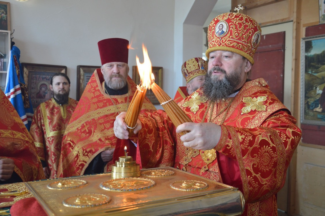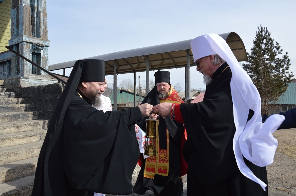 Перед началом богослужения прихожане зажгли свечи и лампады от пламени Благодатного огня, доставленного митрополитом Димитрием в Нерчинскую епархию.