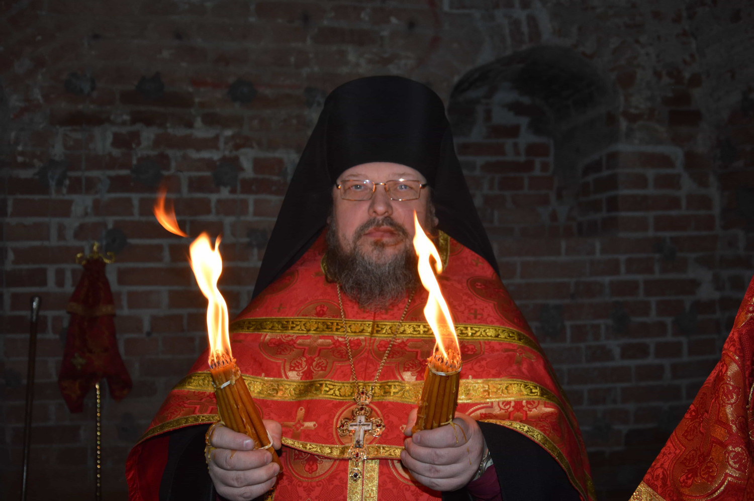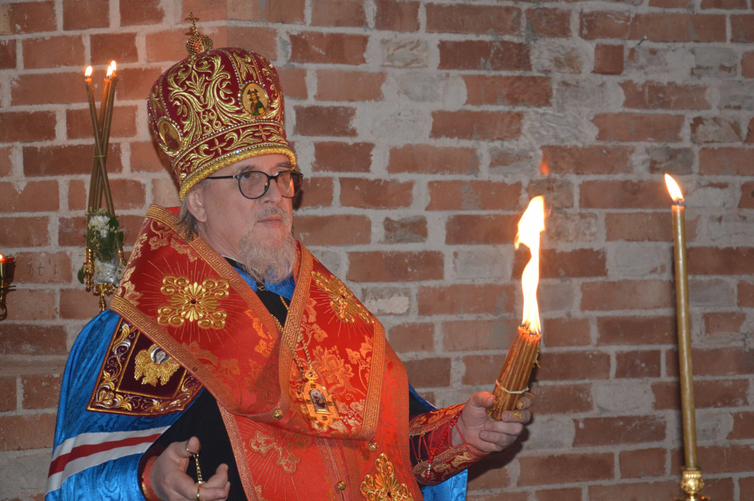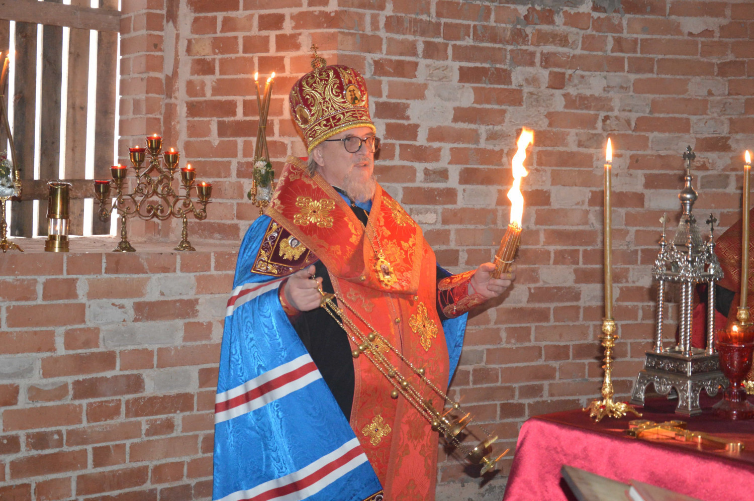 Перед началом богослужения верующие зажгли свечи и лампады от пламени Благодатного огня, доставленного митрополитом Димитрием в Нерчинскую епархию.